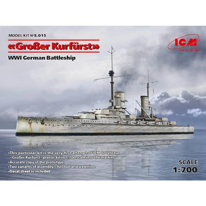 Maquette bateau Grosser Kurfurst (full hull & waterline), WWI German Battleship • This particular kit is the very first attempt of ICM to release Großer Kurfürst plastic kit in 1:700 scale into the market• Accurate copy of the prototype• Two variants of assembly – full hull and waterline• Decal sheet is included