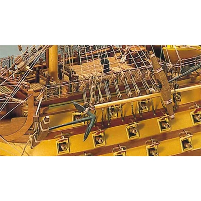 Accastillage inclus dans la boîte comprenant poulies et caps de mouton en buis, canons, cabillots en laiton tourné, figure de proue moulée en bronze, lanternes à monter, ancre, chaloupes, fil de gréement, pavillons en tissu imprimé.
