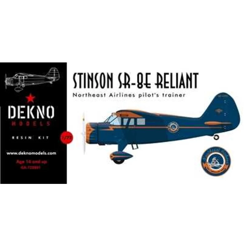 Fiche technique Stinson SR-8E Reliant Northeast Airlines pilot trainer. 1/72 scale model resin kit with resin clear for the windows and windscre